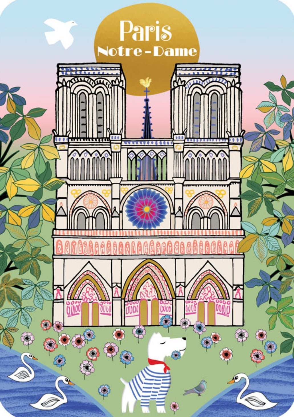 Cartes d'Art - Notre Dame - Paris - Fance - Dog - Swans - Flowers - Postcard with foil details