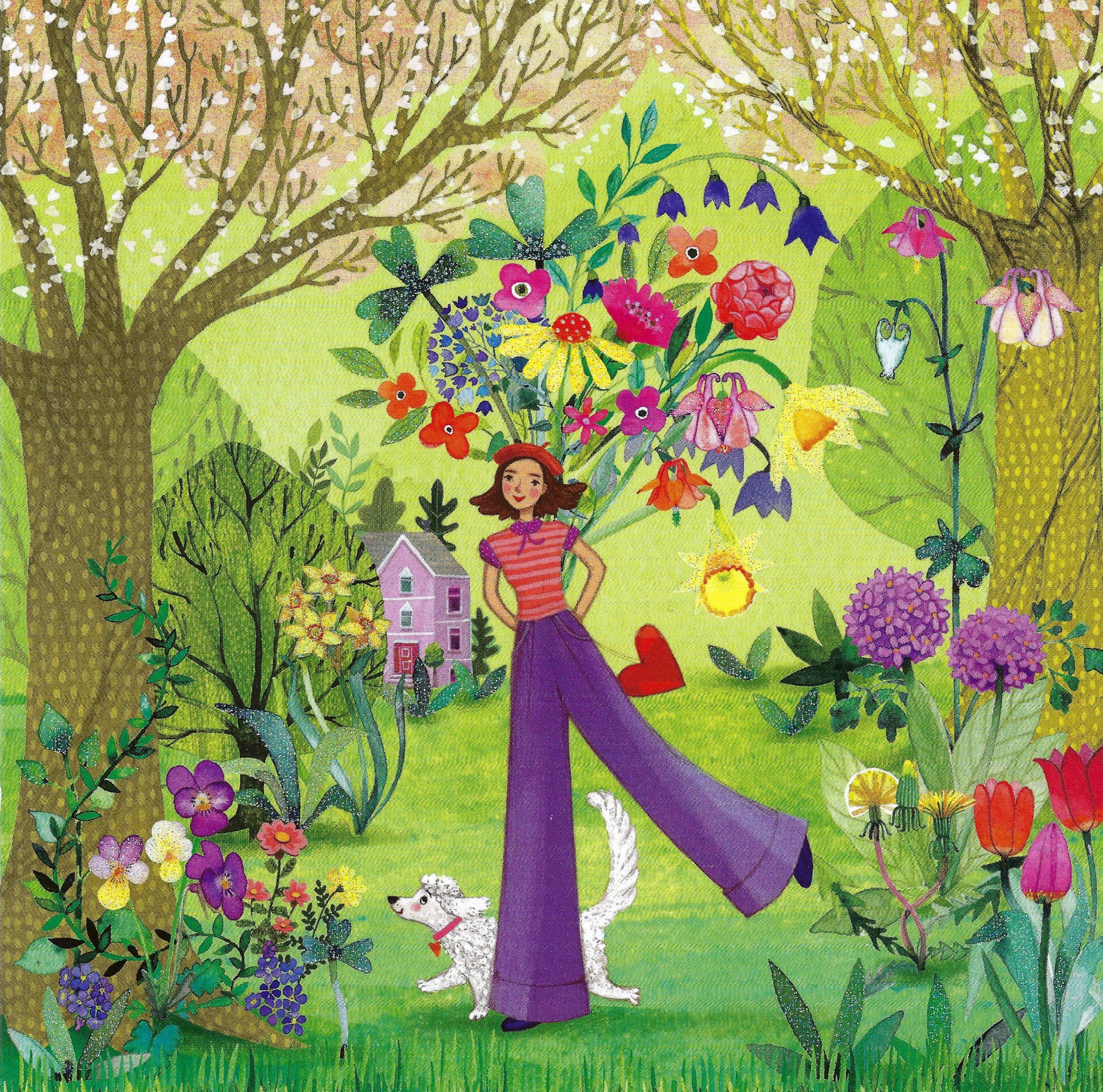 Mila Marquis - Woman with Bouquet of Flowers and Dog - Postcard