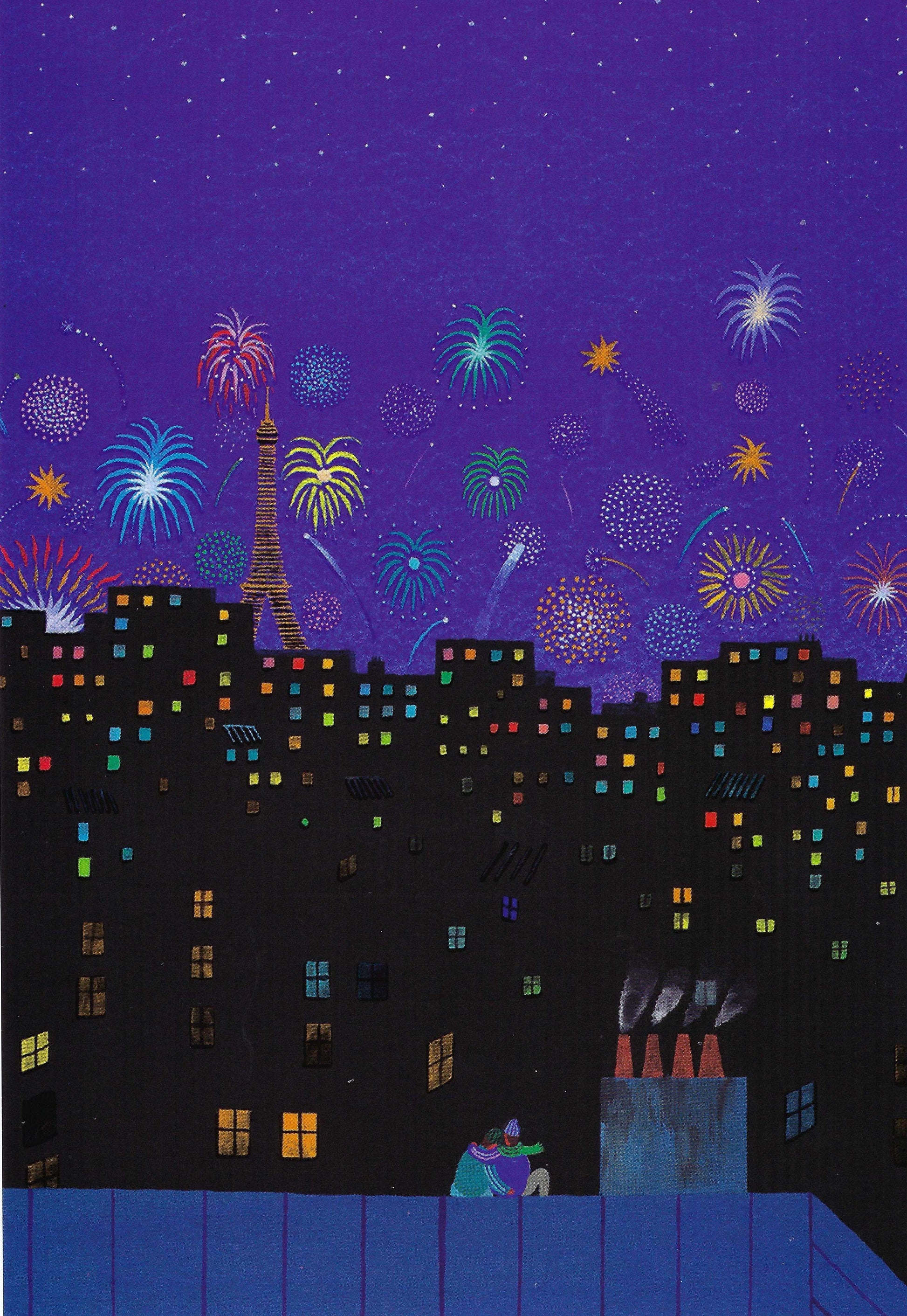 Selva Utopia - Jean Mallard - Rooftop with a View - Paris - Night -Couple - Eiffel Tower - Fireworks - Postcard with pretty varnish details.