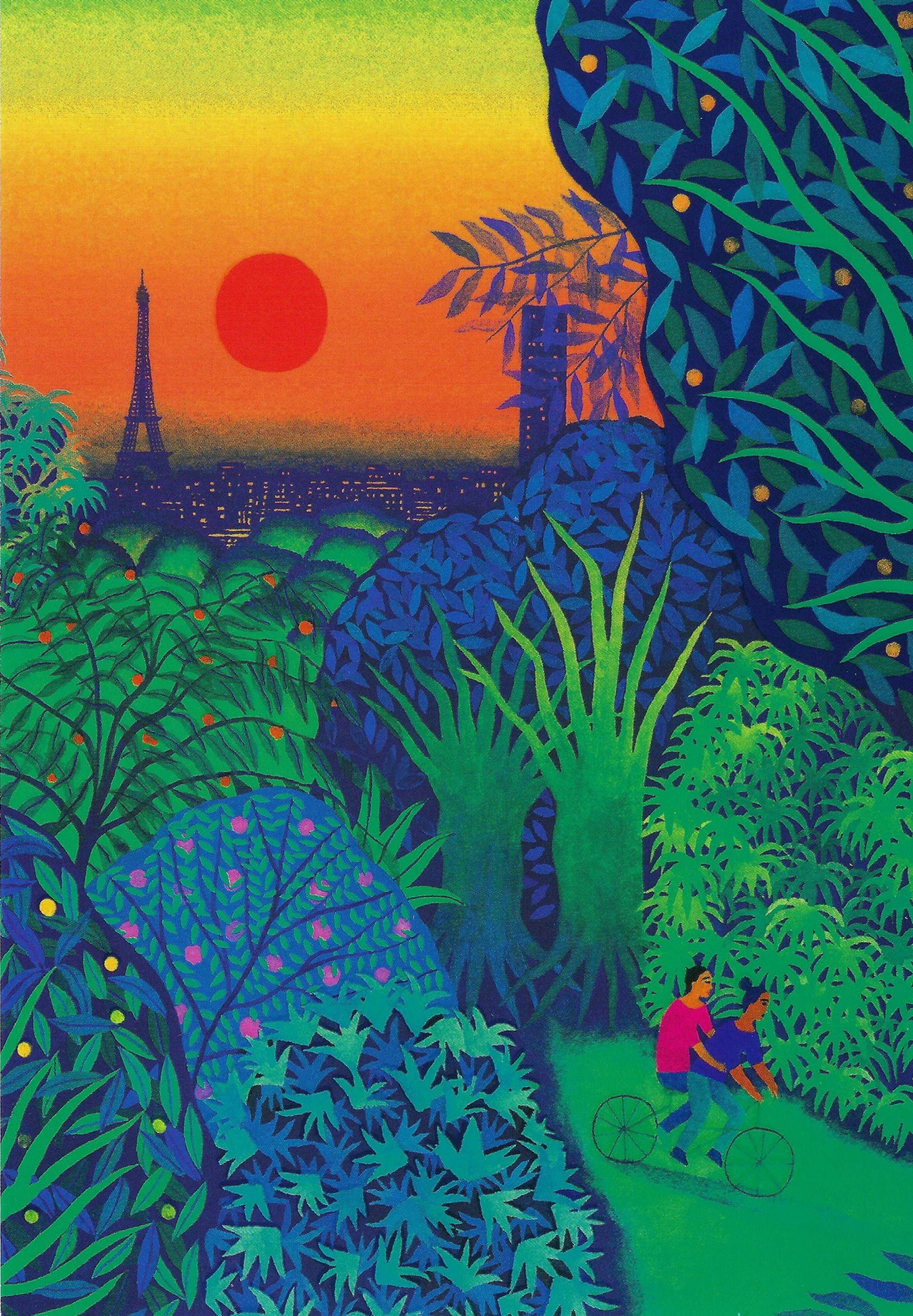 Selva Utopia - Jean Mallard - Bicycling - Couple - Views - Trees - Eiffel Tower - Postcard with varnish details.