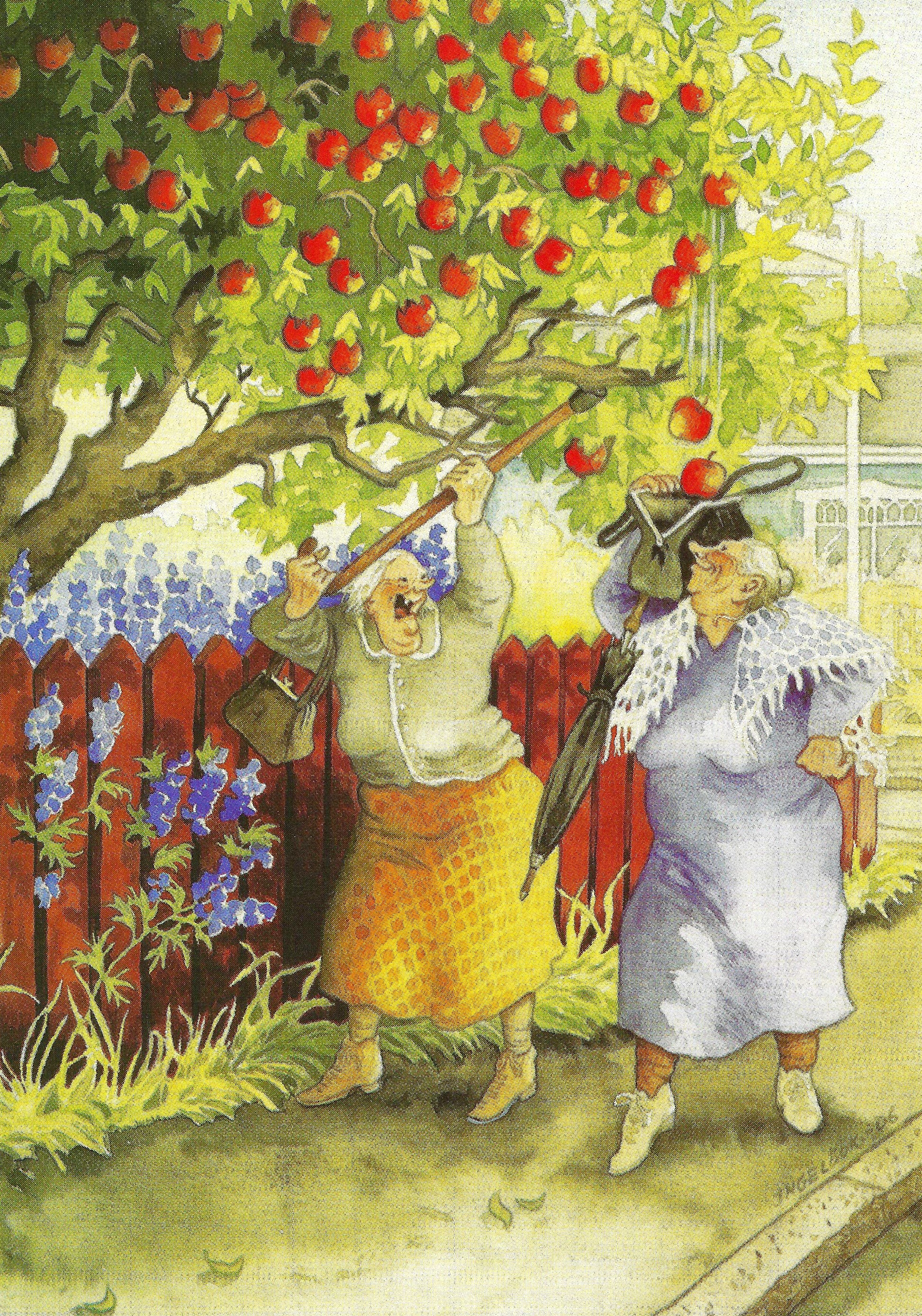 Inge Löök - Women Shaking Apple Tree - Friends - Aunties - Old Ladies - Postcard