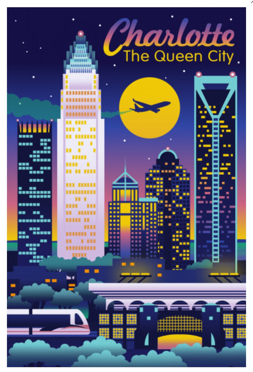 Lantern Press - Charlotte, North Carolina - Retro Skyline Chromatic Series - Postcard