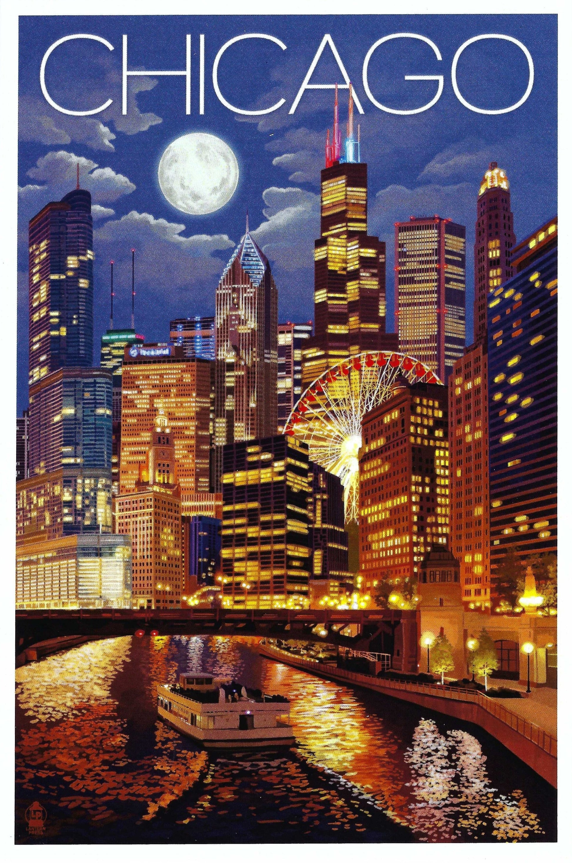 Lantern Press - Chicago - Illinois - City - Skyline at Night - Postcard